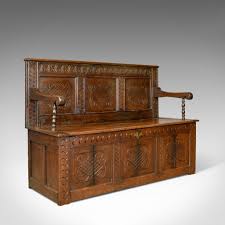 Antique hall bench seat. Hungarian wooden painted bench. Until the late 17th century most people sat on benches chairs being the preserve of the rich or the elderly and they continued to be used in farmhouses and schoolrooms until comparatively recent times. This antique carved oak monks bench has a carved top the top lifts to form a bench and has a carved detailed back.