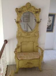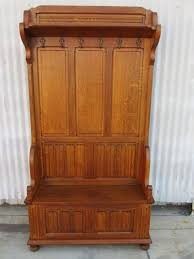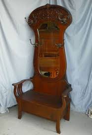 Bench antique hall tree. Organize your outerwear with antique hall trees and stands. Many foyers and front halls don t have a closet so the next best option is a hall tree for a place to hang coats hats and a place to sit down if you opt for a model with a bench. Usually ships within 5 to 7 days.