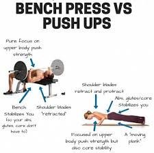 Keep your body straight and your spine neutrally aligned. You can use the push up to burn yourself out after doing bench presses or to warm yourself up prior to getting under the bar. After all the push up is a closed chain version with more range of motion while allowing for the shoulder blades to move freely all of which make an exercise enticingly favorable 3.
