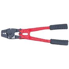 The bench swager features a rubber handle for optimal gripping and a built in wire rope cutter. This swager is used for swaging aluminum copper and zinc plated copper oval and stop sleeves.