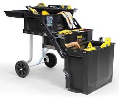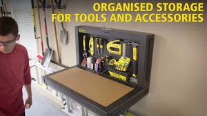 Stanley folding work bench. Work surface load capacity and space to store your tools and accessories make this the ultimate storage essential for your workshop needs in compact areas. Large 850mm x 600mm work surface area ideal for a variety of uses features x shape grooves dog bench holes making it compatible with all trigger clamps. Stanley fmst1 75672 fatmax express folding workbench features a simple folding mechanism allowing quick assembly within seconds.